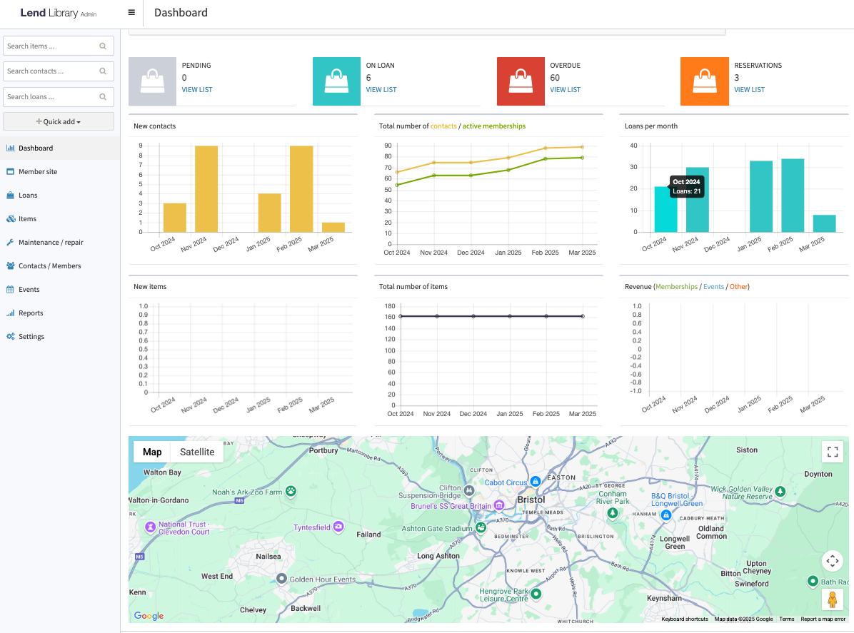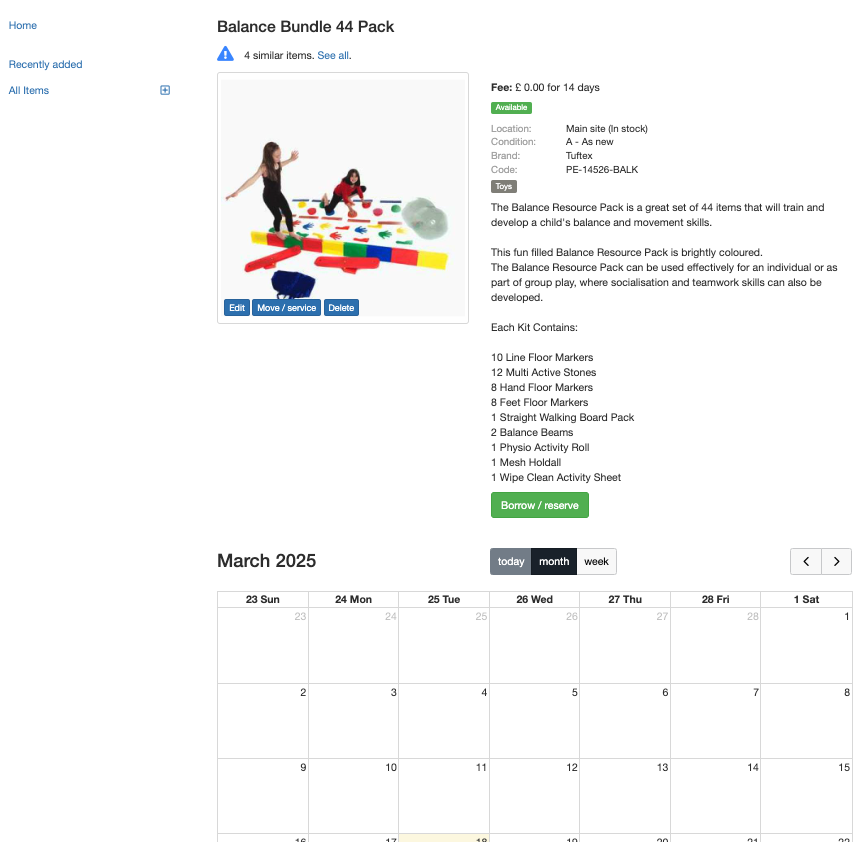 An online database to store all your item information. Custom fields, multiple images, multiple item locations, schedule maintenance. Build kits. Add services and consultancy to loans. And much more.