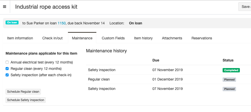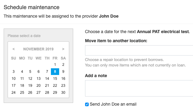 If your items need regular servicing (perhaps an annual electrical test), then it's easy to schedule a repeating service. When the next service is due, you (or your service provider) will get a reminder that work needs doing. If it's the kind of work that prevents someone borrowing an item - perhaps insurane prevents you lending your items where electrical test has expired - then that's easy to manage as well.